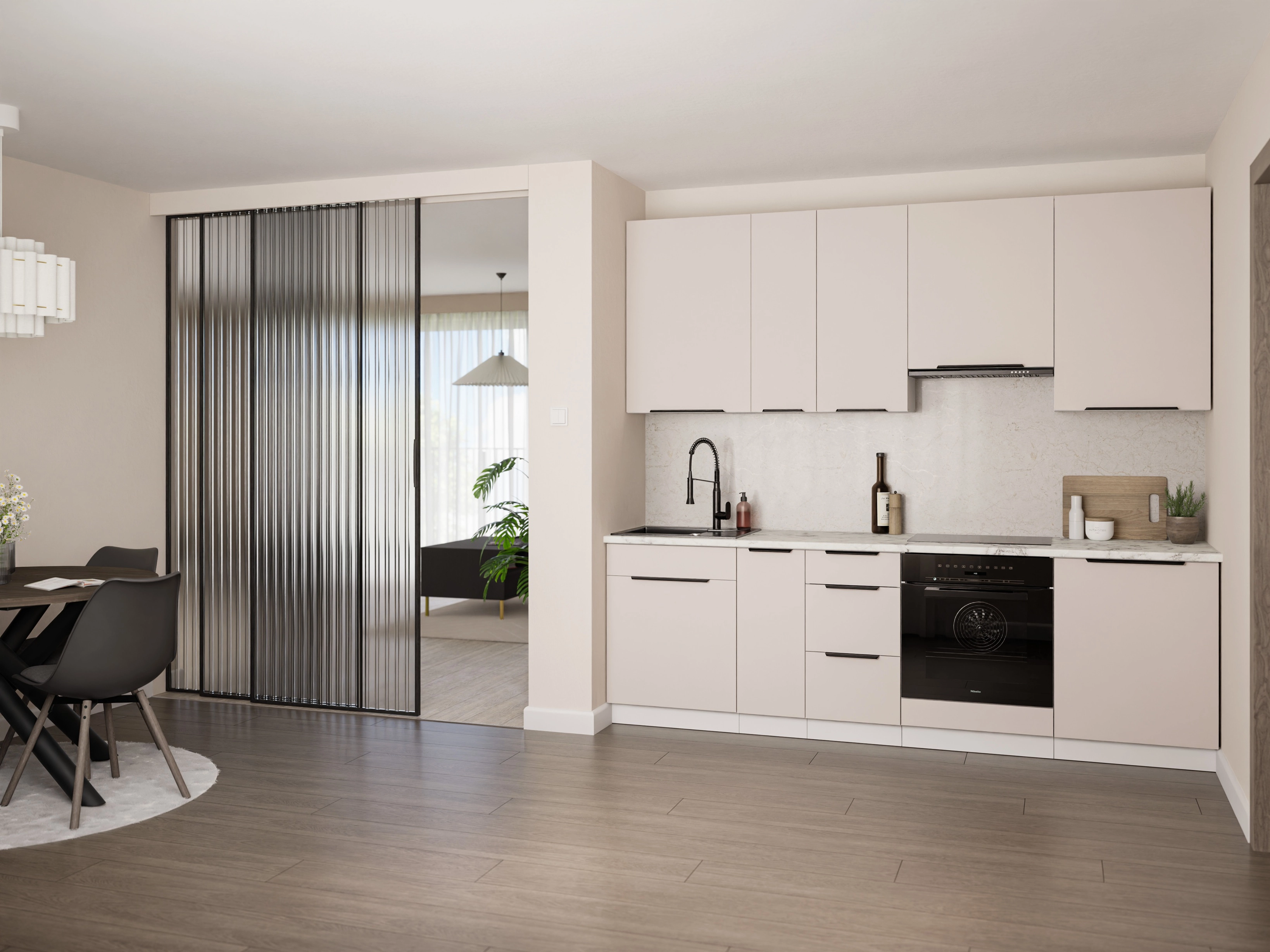 Kolekcja mebli kuchennych KOMO to propozycja dla osób, które lubią jasne, spokojne wnętrza z nutą ciepła. Fronty w odcieniu kaszmiru tworzą delikatną, elegancką bazę, która dobrze rozjaśnia przestrzeń i wprowadza przyjemny, domowy klimat. To kolor, który nie wychodzi z mody i łatwo dopasować go do różnych stylów – od nowoczesnych po bardziej klasyczne aranżacje. Biały korpus podkreśla lekkość zabudowy i sprawia, że całość wygląda świeżo i spójnie.