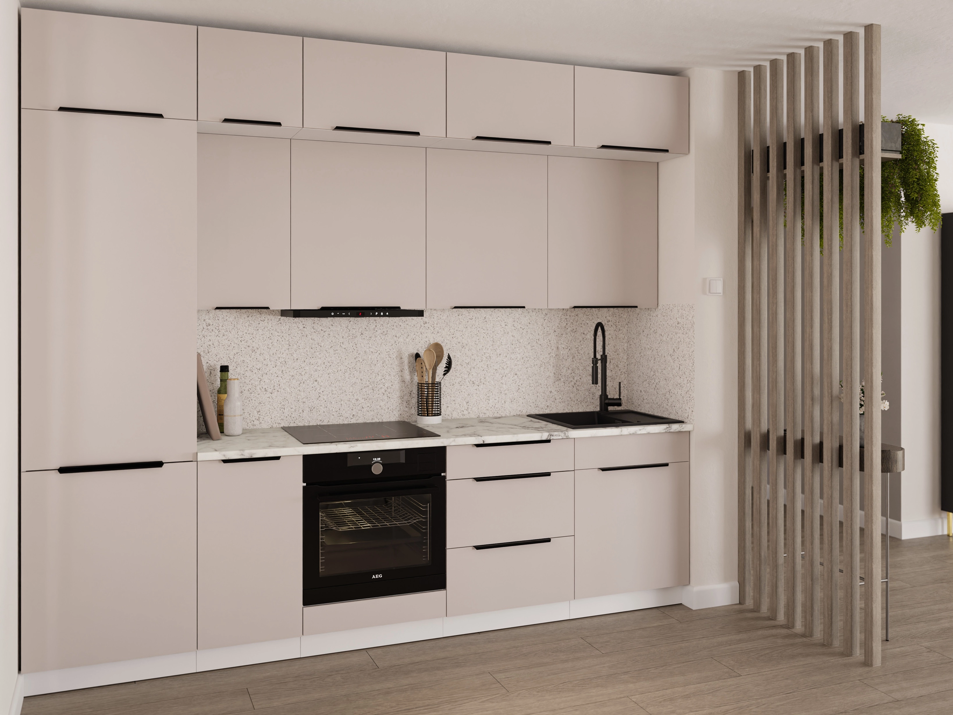 Kolekcja mebli kuchennych KOMO to propozycja dla osób, które lubią jasne, spokojne wnętrza z nutą ciepła. Fronty w odcieniu kaszmiru tworzą delikatną, elegancką bazę, która dobrze rozjaśnia przestrzeń i wprowadza przyjemny, domowy klimat. To kolor, który nie wychodzi z mody i łatwo dopasować go do różnych stylów – od nowoczesnych po bardziej klasyczne aranżacje. Biały korpus podkreśla lekkość zabudowy i sprawia, że całość wygląda świeżo i spójnie.