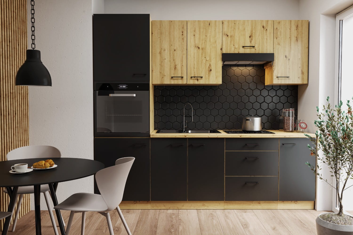 Zestaw mebli kuchennych MILO charakteryzuje się modną kolorystyką. Kolekcja zawiera 32 szafki, które można łatwo dopasować do pomieszczenia. Dębowy mebel nada przytulnego klimatu, a kontrastujące czarne fronty i uchwyty, nadadzą kuchni eleganckiego wyglądu.
