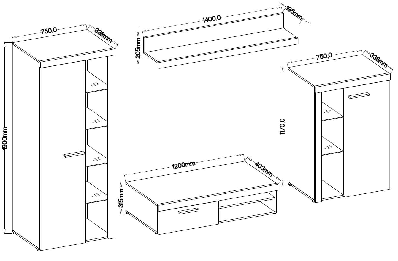 Meblościanka RABBIA wyróżnia się nowoczesną stylistyką i na pewno przypadnie do gustu fanom funkcjonalnej i prostej formy. Zestaw składa się z dwóch częściowo otwartych pojemnych witryn, które poza widocznymi szklanymi półkami, za drzwiami skrywają jeszcze 6 półek; jednodrzwiowej szafki pod telewizor z półkami na sprzęt RTV oraz ustawnej półeczki wiszącej. Zestaw świetnie sprawdzi się w salonie, jak i pokoju młodzieżowym.