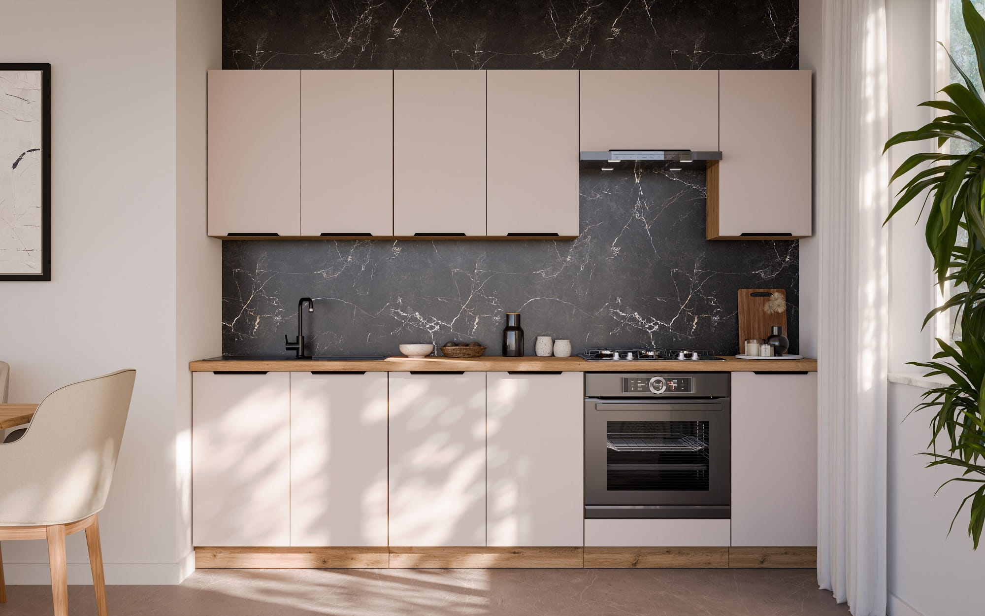 Kolekcja mebli kuchennych SANA to nowoczesne i praktyczne rozwiązanie, które doskonale sprawdzi się w każdej kuchni. Subtelne, kaszmirowe fronty w połączeniu z ciepłym odcieniem korpusów w kolorze dąb artisan tworzą elegancką i przytulną kompozycję. Modułowa budowa kolekcji SANA obejmuje szeroki wybór szafek – od wiszących, przez stojące, aż po wysokie kominy i elementy pod zabudowę lodówki, piekarnika, zmywarki czy mikrofali. Dzięki różnorodności wymiarów i konfiguracji, bez trudu stworzysz zestaw idealnie dopasowany do układu i rozmiaru Twojej kuchni.