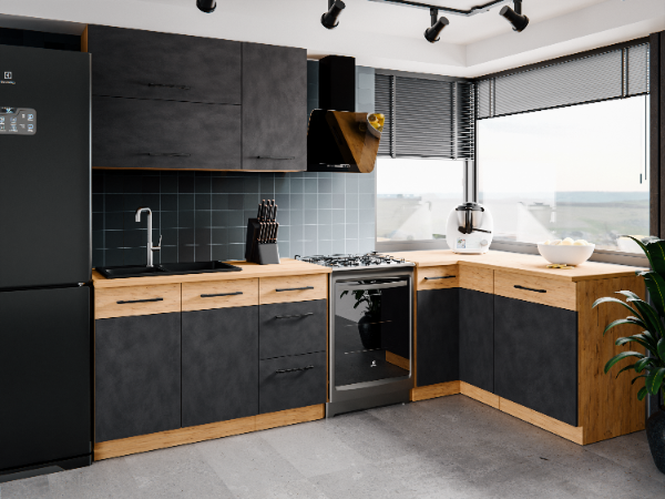 Kolekcja mebli kuchennych WIGO to połączenie, eleganckiego wybarwienia matera, z ciepłym odcieniem drewna. Fronty w kolorze Matera nadają wnętrzu nowoczesny i stylowy charakter, a drewniane elementy wprowadzają naturalny akcent. Czarne, minimalistyczne uchwyty podkreślają nowoczesny design, a funkcjonalny układ szafek i szuflad zapewnia wygodę użytkowania. W skład kolekcji WIGO wchodzi kilkadziesiąt szafek, dzięki którym dobierzesz meble pod wymiar swojej kuchni.