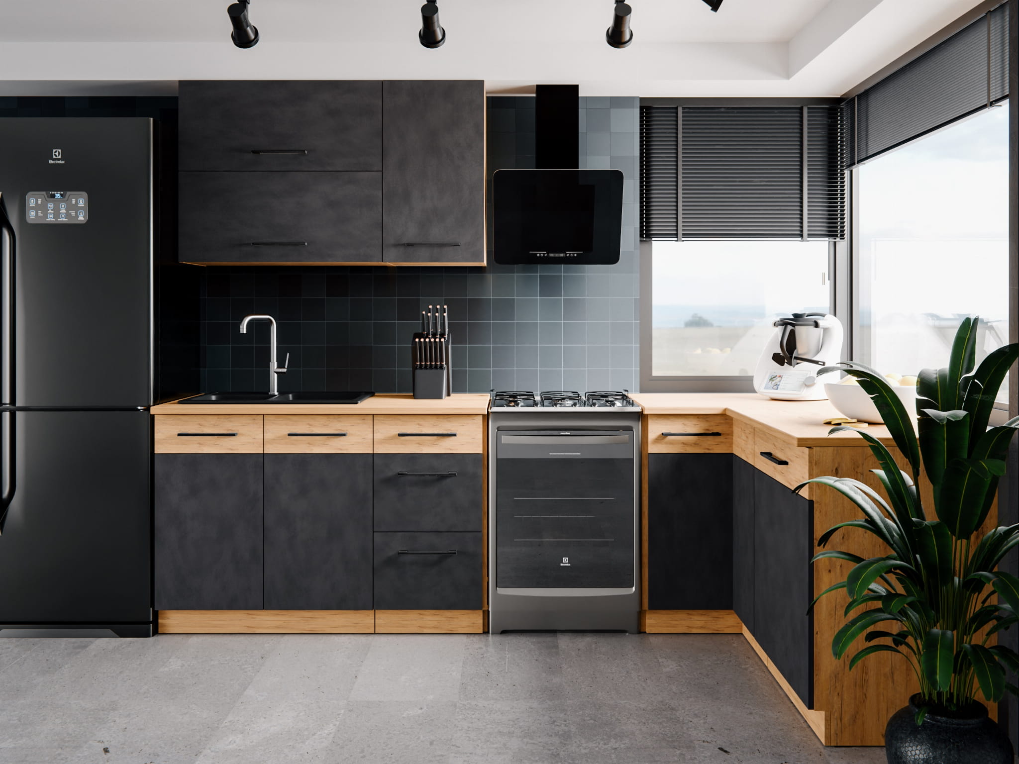 Kolekcja mebli kuchennych WIGO charakteryzuje się modną kolorystyką, łączącą elegancką materę z ciepłym odcieniem drewna. Fronty w kolorze Matera nadają wnętrzu nowoczesny i stylowy charakter, a drewniane elementy wprowadzają naturalny akcent. Czarne, minimalistyczne uchwyty podkreślają nowoczesny design, a funkcjonalny układ szafek i szuflad zapewnia wygodę użytkowania. W skład kolekcji WIGO wchodzi kilkadziesiąt szafek, dzięki którym dobierzesz meble pod wymiar swojej kuchni.