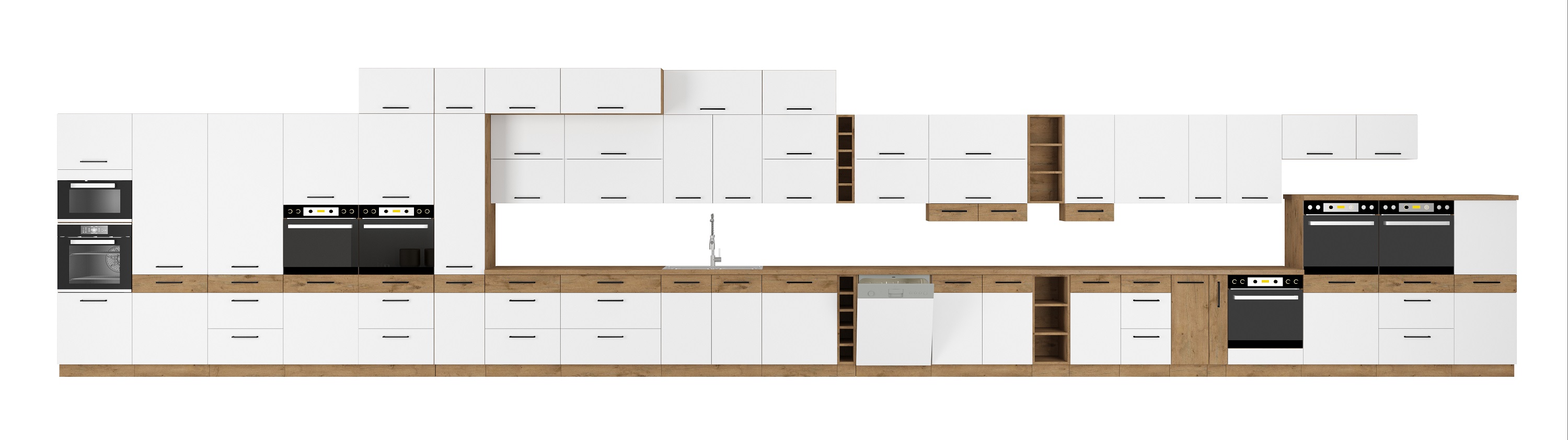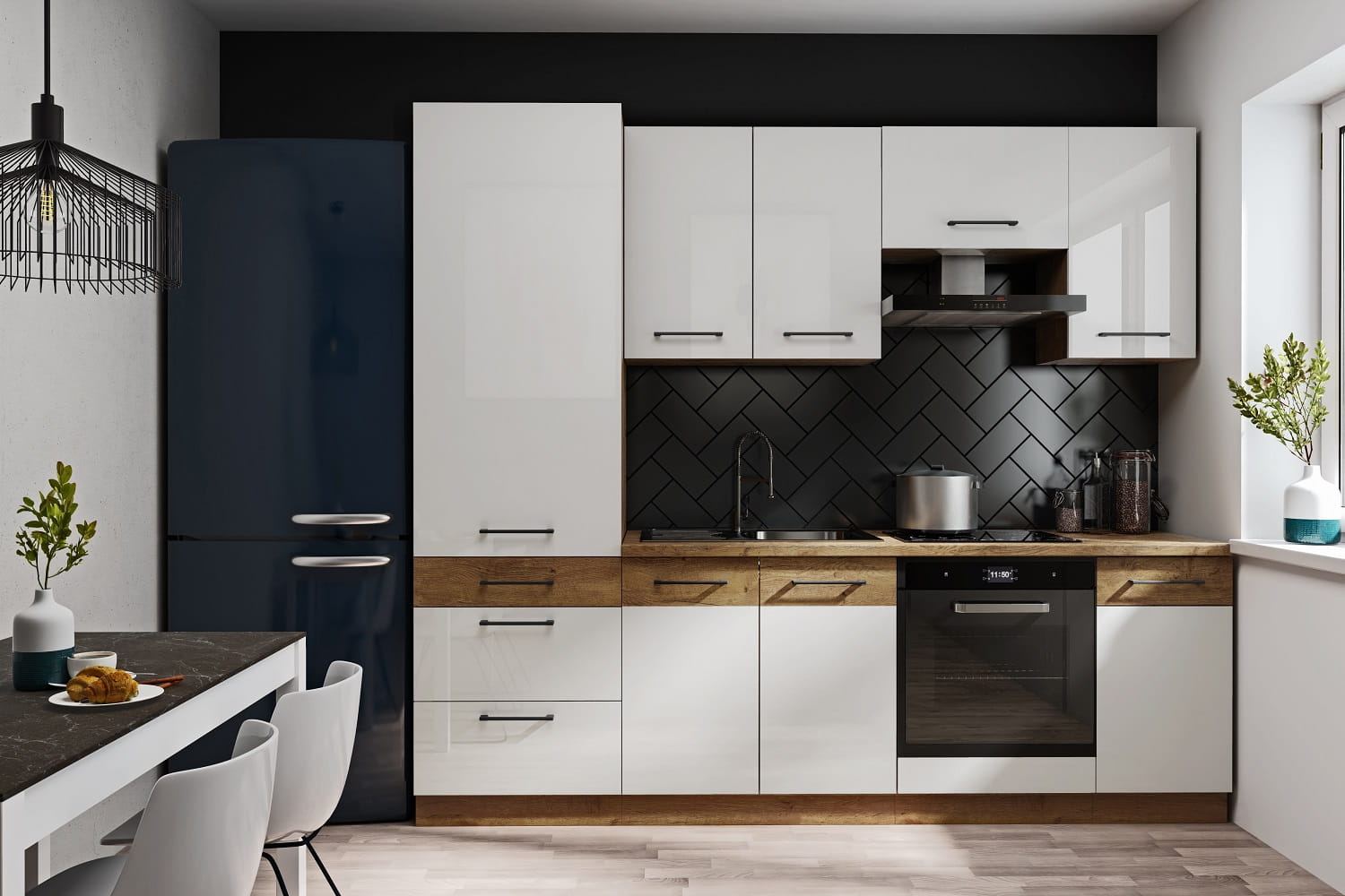 Kolekcja mebli kuchennych WIGO to wieloelementowy zestaw dzięki któremu dobierzesz meble pod wymiar swojej kuchni. Kolekcja WIGO to połączenie klasycznej i eleganckiej bieli z ciepłym, odcieniem drewna. Połyskujące białe fronty nadadzą Twojej kuchni nowoczesny i stylowy charakter i idealnie współgrający z brązowym korpusem w odcieniu Dąb Lancelot. Do tego czarne, minimalistyczne uchwyty i mamy wszystko czego potrzeba w kuchni.