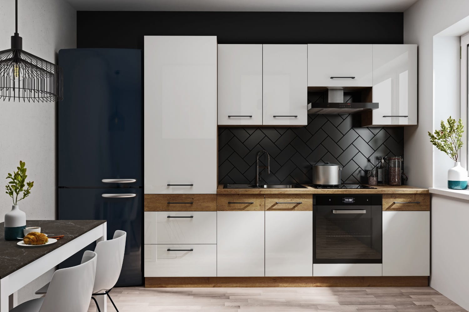 Kolekcja mebli kuchennych WIGO to wieloelementowy zestaw dzięki któremu dobierzesz meble pod wymiar swojej kuchni. Kolekcja WIGO to połączenie klasycznej i eleganckiej bieli z ciepłym, odcieniem drewna. Połyskujące białe fronty nadadzą Twojej kuchni nowoczesny i stylowy charakter, idealnie współgrający z brązowym korpusem w odcieniu Dąb Lancelot. Do tego czarne, minimalistyczne uchwyty i mamy wszystko czego potrzeba w kuchni.