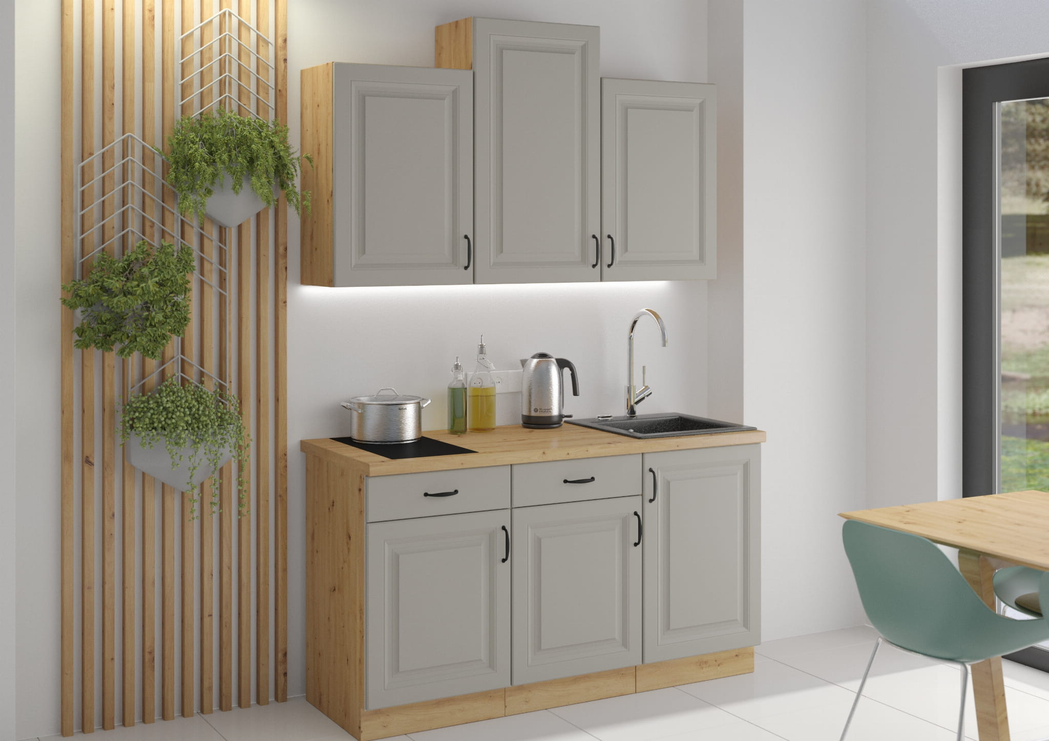 Kolekcja mebli kuchennych STELVIO charakteryzuje się modną kolorystyką, frezowanymi frontami oraz czarnymi metalowymi uchwytami. Połączenie białego koloru z odcieniem szarości zadowoli nawet najbardziej wymagające gusta. Jasny odcień szarości rozjaśni i powiększy wnętrze, a dębowy odcień korpusów nada przytulnego klimatu. Z kolei stylowe frezowania frontów oraz, kontrastujące czarne uchwyty dodadzą kuchni eleganckiego wyglądu.