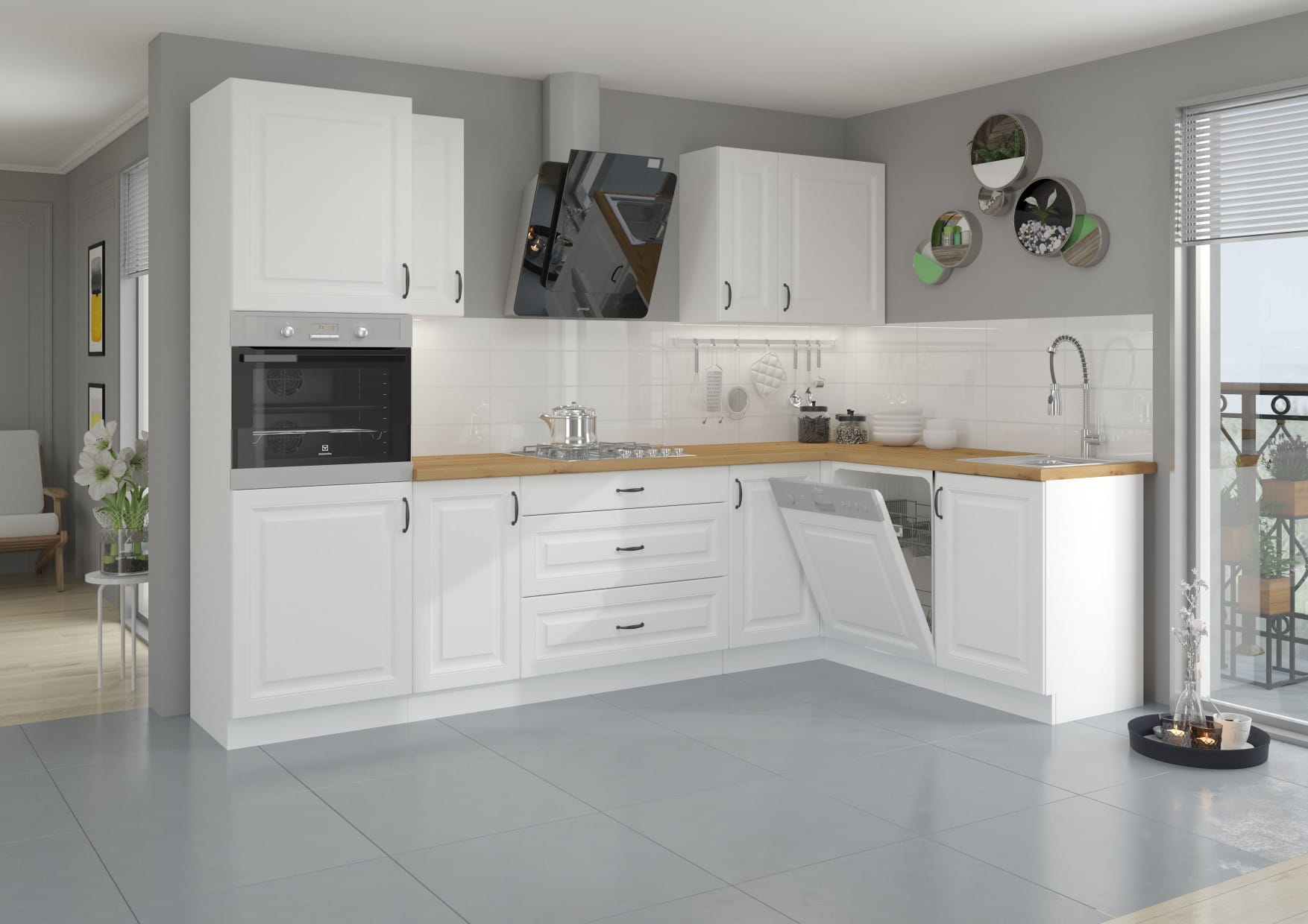 Kolekcja mebli kuchennych STELVIO charakteryzuje się modną kolorystyką, frezowanymi frontami oraz czarnymi metalowymi uchwytami. Połączenie bieli i czarnych kontrastujących uchwytów zadowoli nawet najbardziej wymagające gusta. Biały kolor rozjaśni i powiększy wnętrze, a stylowe frezowania frontów nadadzą kuchni eleganckiego wyglądu.
