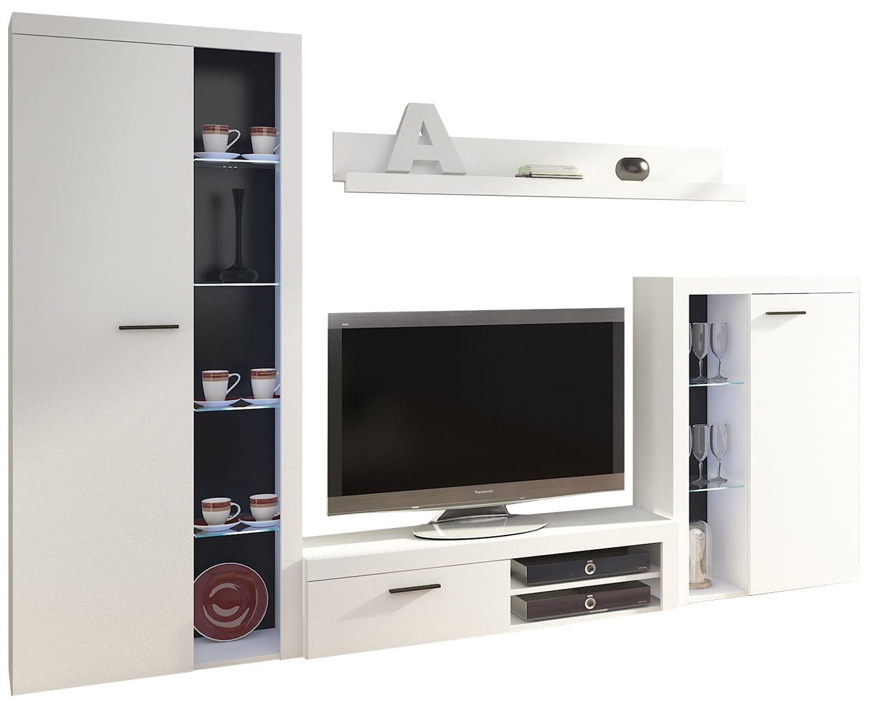 Meblościanka RABBIA wyróżnia się nowoczesną stylistyką i na pewno przypadnie do gustu fanom funkcjonalnej i prostej formy. Zestaw składa się z dwóch pojemnych witryn, które poza widocznymi szklanymi półkami w środku mają jeszcze 6 półek; jednodrzwiowej szafki pod telewizor z półkami na sprzęt RTV oraz ustawnej półeczki wiszącej. Zestaw świetnie sprawdzi się w salonie, jak i pokoju młodzieżowym.