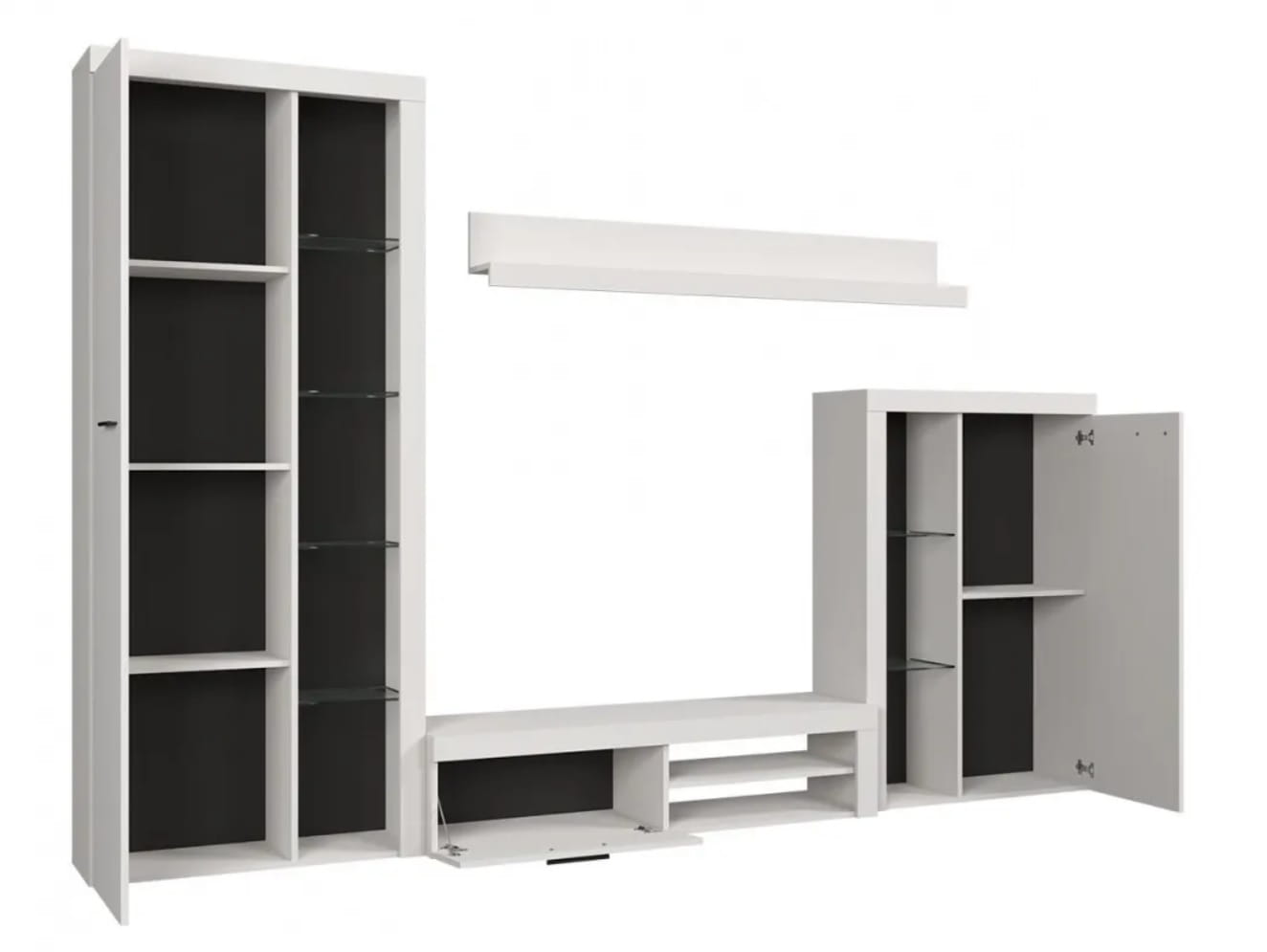 - Meblościanka sprzedawana wyłącznie w komplecie (brak możliwości zakupu poszczególnych mebli osobno).
