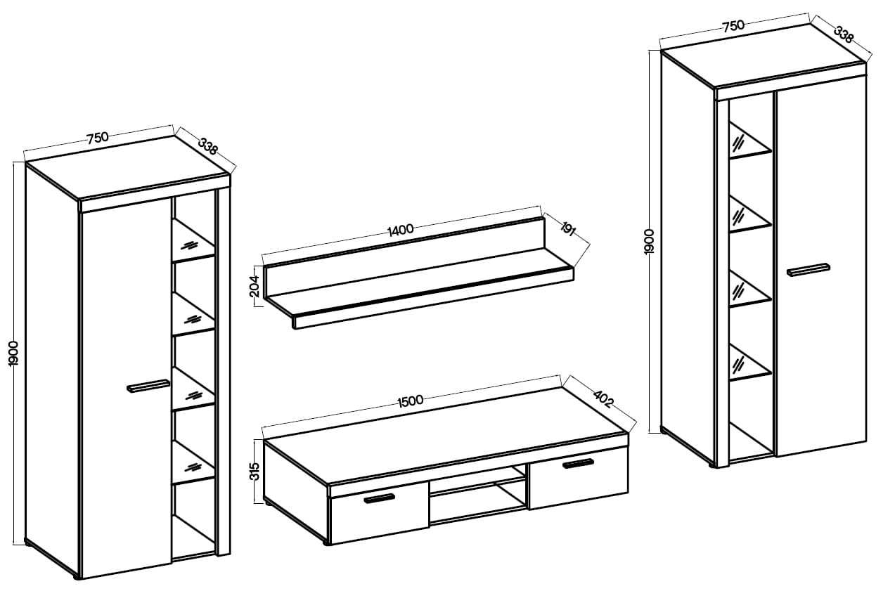- Meblościanka sprzedawana wyłącznie w komplecie (brak możliwości zakupu poszczególnych mebli osobno).