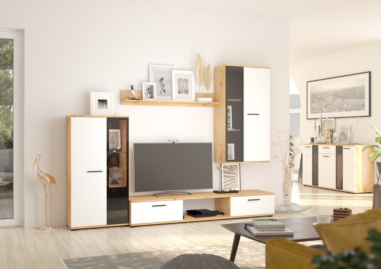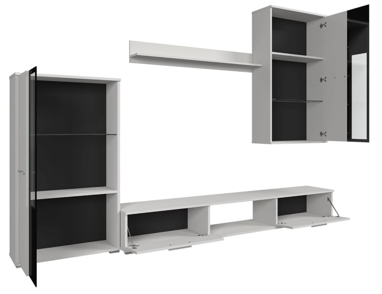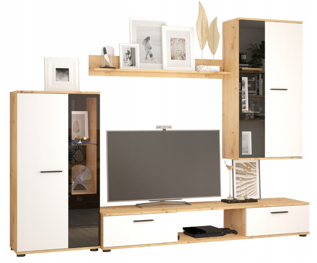 Zestaw składa się z dwóch częściowo przeszklonych szafek, wiszącej półki, oraz dwudrzwiowej szafki pod telewizor, z miejscem na sprzęt RTV po środku.