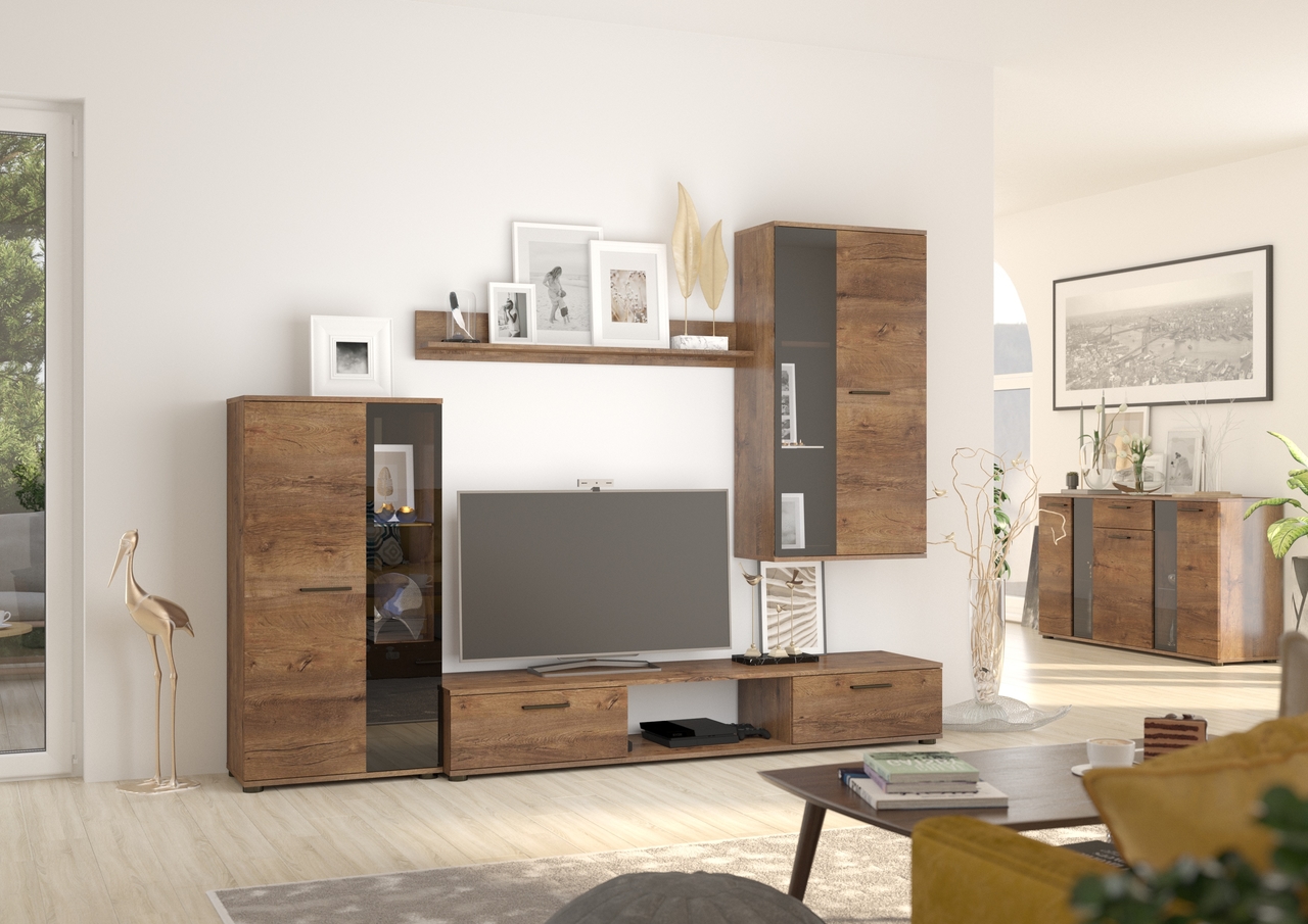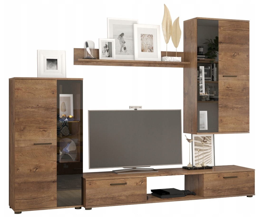 Zestaw składa się z dwóch częściowo przeszklonych szafek, wiszącej półki, oraz dwudrzwiowej szafki pod telewizor, z miejscem na sprzęt RTV po środku.
