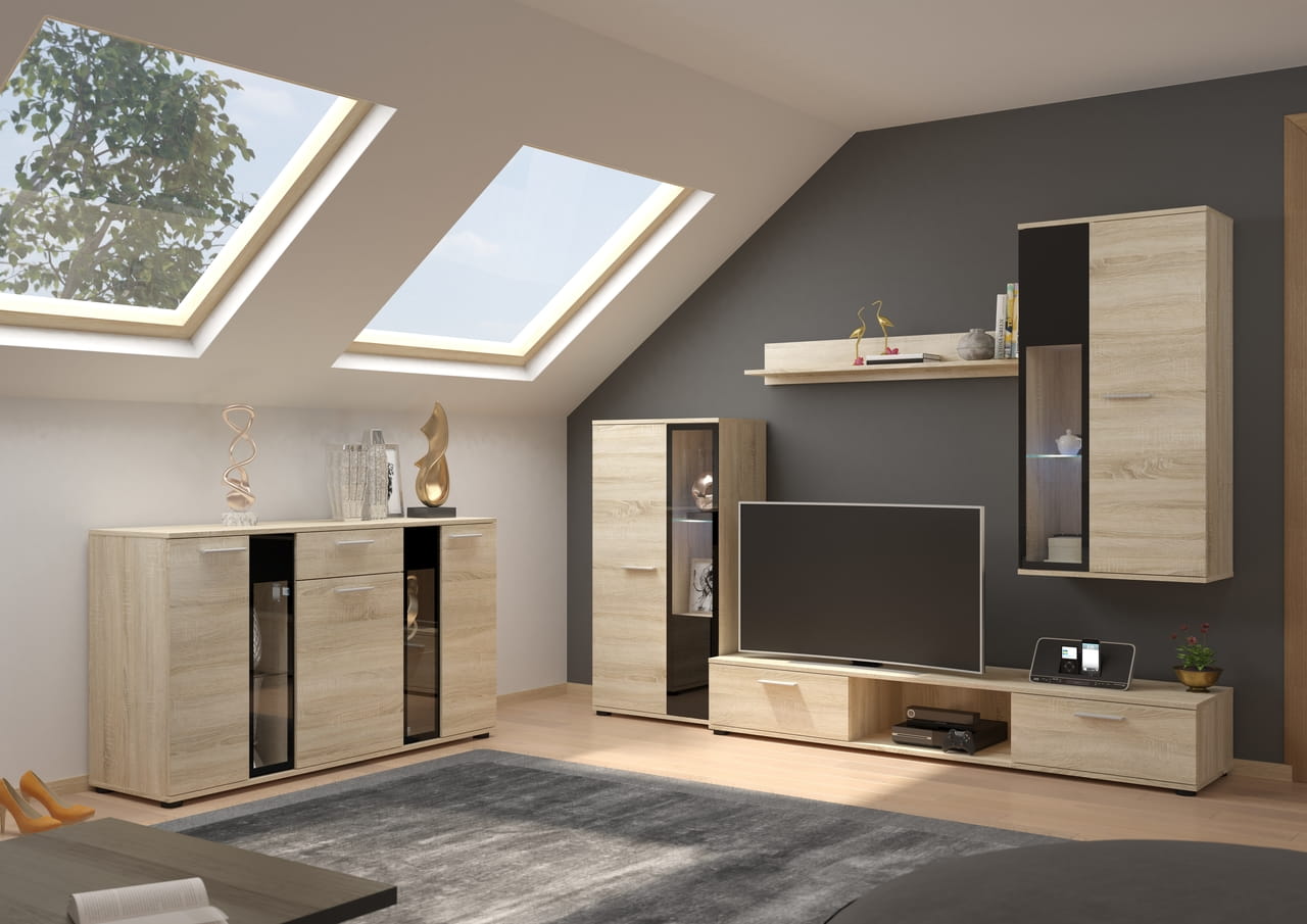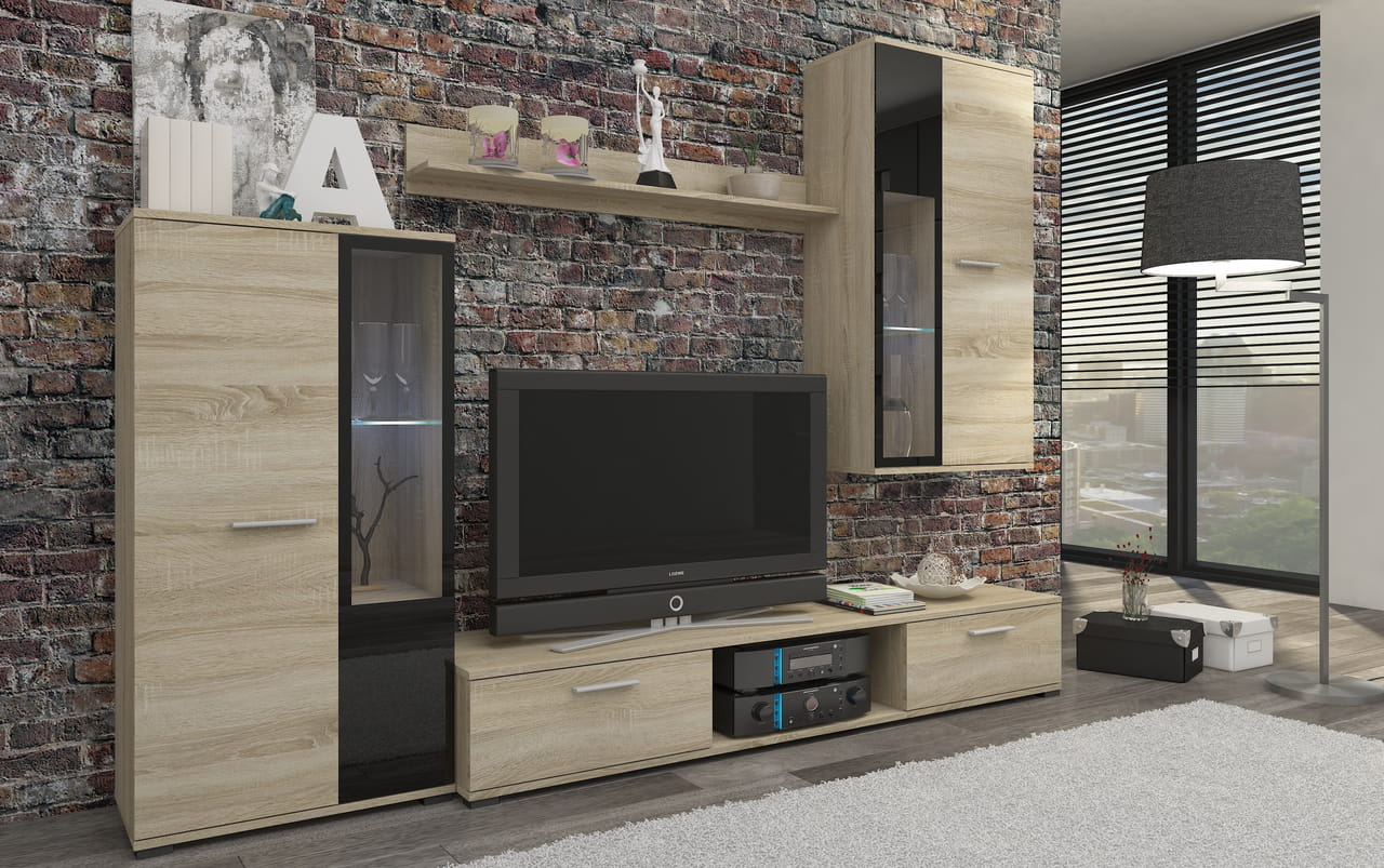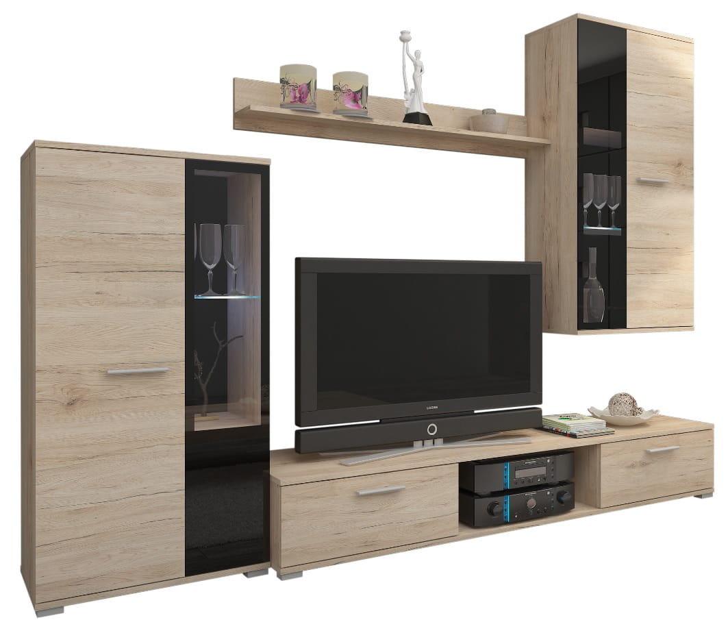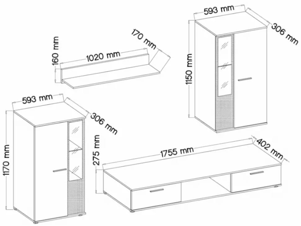 Zestaw składa się z dwóch częściowo przeszklonych szafek, wiszącej półki, oraz dwudrzwiowej szafki pod telewizor, z miejscem na sprzęt RTV po środku.