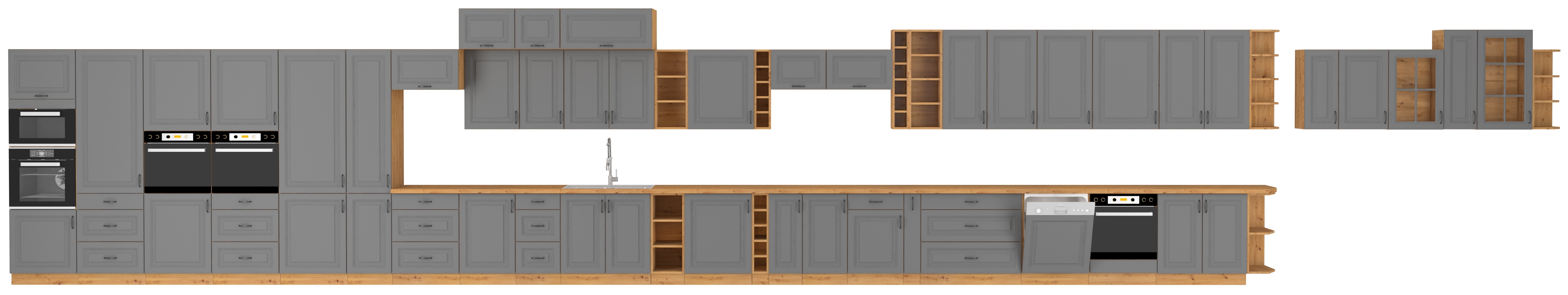 Kolekcja mebli kuchennych STELVIO charakteryzuje się modną kolorystyką, frezowanymi frontami oraz czarnymi metalowymi uchwytami. Połączenie Ciemnoszarych frontów z odcieniem imitującym drewno zadowoli nawet najbardziej wymagające gusta. Ciemny odcień szarości podkreśli klasyczny wygląd, a korpus w kolorze dębu artisan nada przytulnego klimatu. Z kolei stylowe frezowania frontów oraz, czarne uchwyty nadadzą kuchni eleganckiego wyglądu.