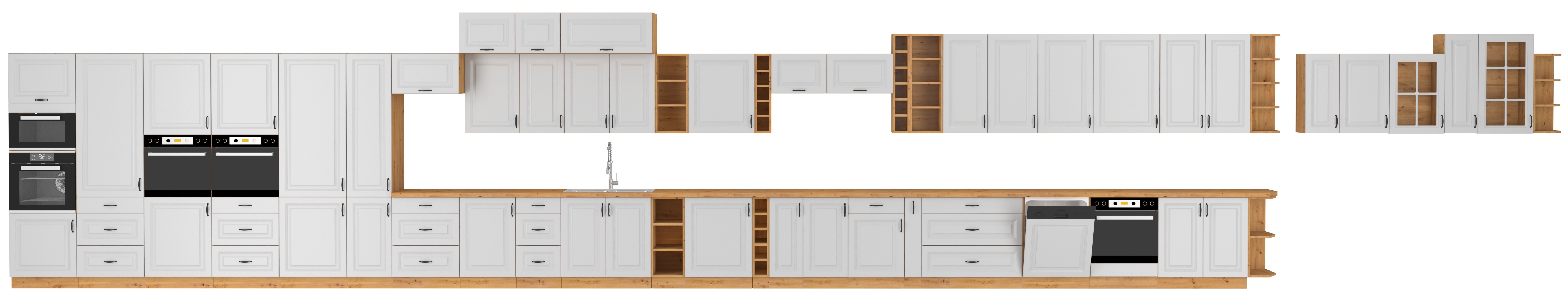 Kolekcja mebli kuchennych STELVIO charakteryzuje się modną kolorystyką, frezowanymi frontami oraz czarnymi metalowymi uchwytami. Połączenie białego koloru z odcieniem dębu artisan zadowoli nawet najbardziej wymagające gusta. Biały kolor rozjaśni i powiększy wnętrze, dębowy korpus nada przytulnego klimatu, a stylowe frezowania frontów oraz, kontrastujące czarne uchwyty, nadadzą kuchni eleganckiego wyglądu.