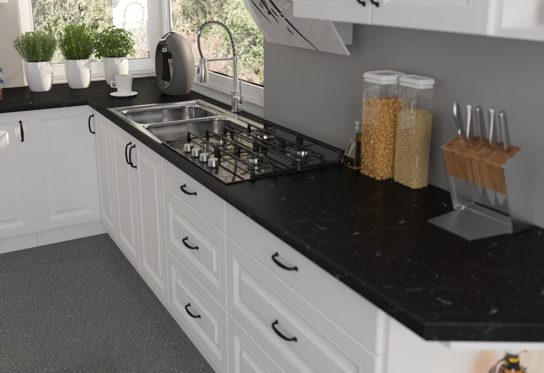 Kolekcja mebli kuchennych STELVIO charakteryzuje się modną kolorystyką, frezowanymi frontami oraz czarnymi metalowymi uchwytami. Połączenie bieli i czarnych kontrastujących uchwytów zadowoli nawet najbardziej wymagające gusta. Biały kolor rozjaśni i powiększy wnętrze, a stylowe frezowania frontów nadadzą kuchni eleganckiego wyglądu.